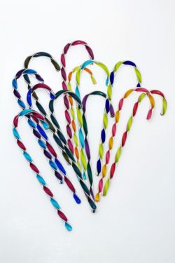 Candy Canes are a staple near the Christmas holidays and its a tradition we like to add our own twist too. We stack hot color, encase it in clear, twist and pull them into forty foot sections of glass canes. From the canes, we measure and bend them individually, then polish the ends and put them away overnight in a kiln.  The next day, it’s like a kid in a candy store.