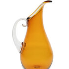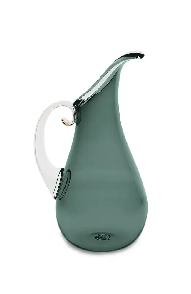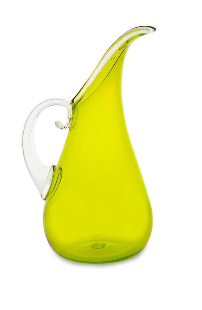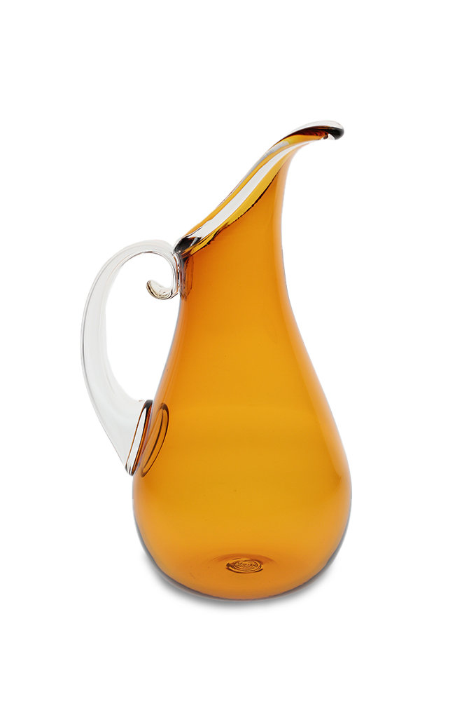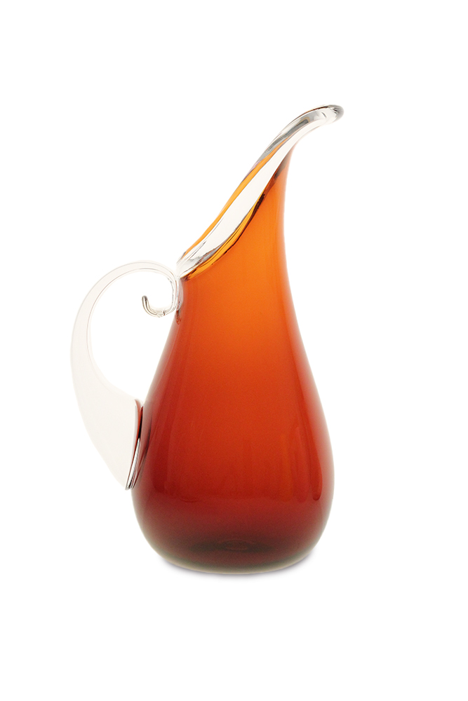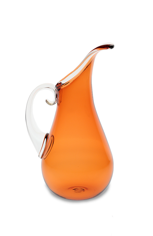 This piece holds a dear place in our heart because it is the first pitcher designed in the Orbix Hot Glass studio. In Cal’s own words when designing this he said, “The elongated spout follows a gentle curve that I echo when shaping the blown handle. This profile line drawn from the tip of the spout, across the full waist, and to the base is watched very closely as I persuade the glass to maintain a beautiful curve.”