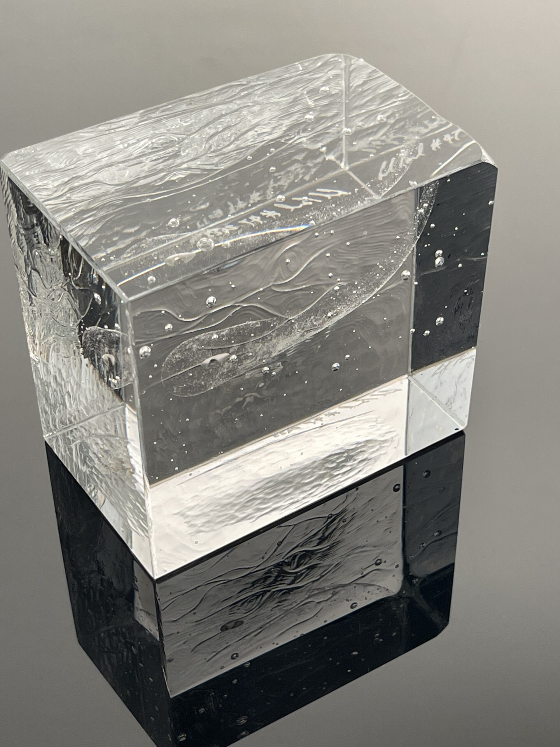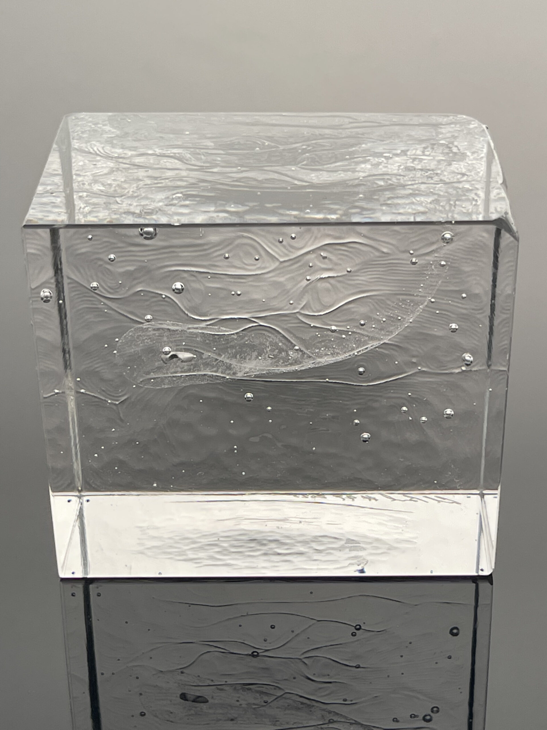 Numer 47 is horizontal arrangement with four sides polished. The amazing clear striations on the interior are water-like. The casting skin is reminiscient of whale eyes.