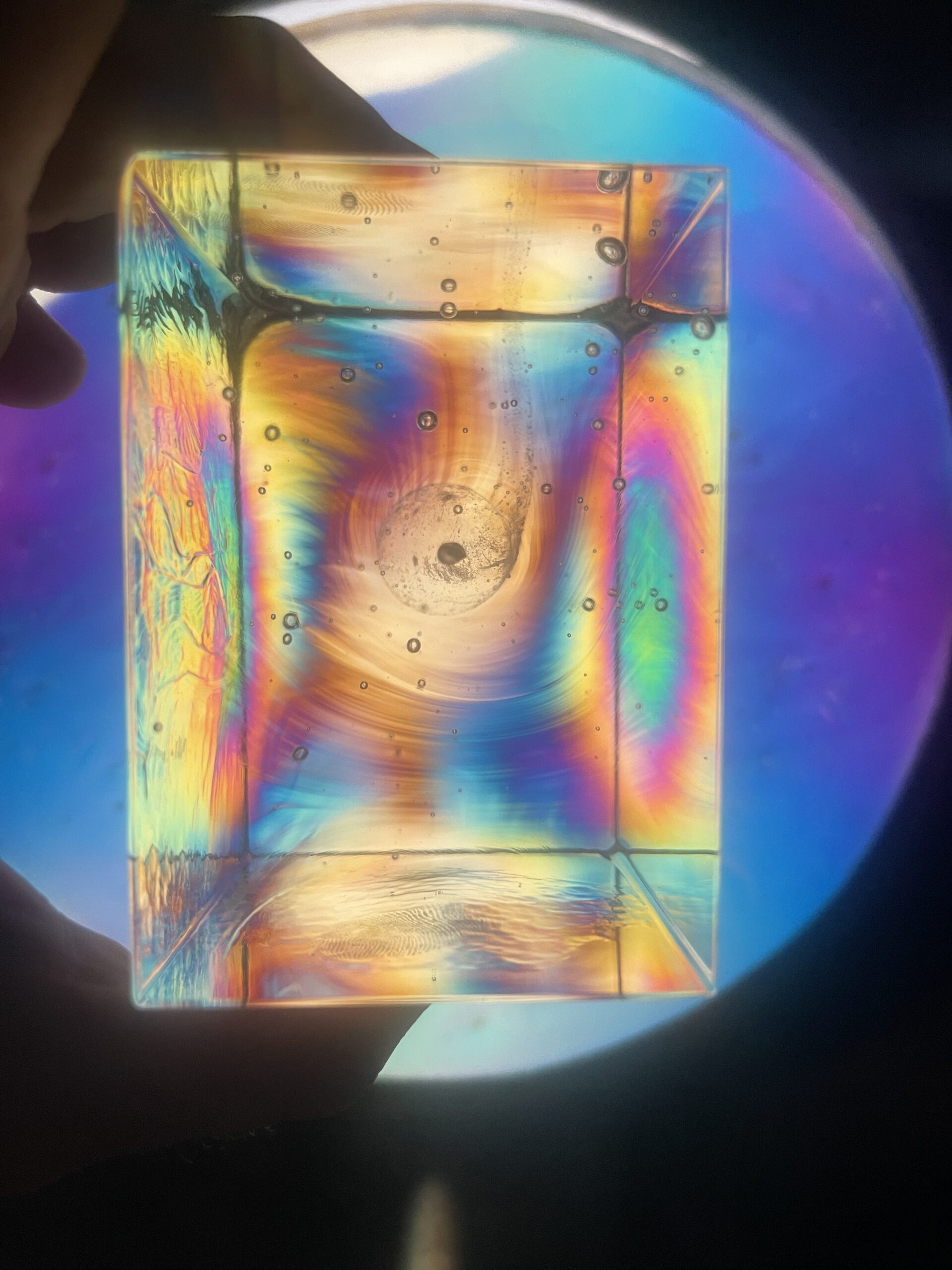 As a sculptor, an ever-expanding understanding of materials is critical in refining one’s ability to fluently translate ideas into expressive physical objects.  These solid works in glass capture a moment in time where a Prince Rupert drop while in a state of great tension is trapped in molten glass when the tail is snapped, and the tension released.  Due to the viscosity of the molten glass, the moment of this tension release is captured in time.  Once, the solid pieces are cooled, carved, and polished an unexpected beauty is revealed under the light of a polariscope which is a tool glass makers use to see stress in their glass wares.  The unique stresses captured in these pieces are all remarkably beautiful.  The surprise of beauty in tension revealed through creative experimentation and exploration is a main reason I love making art.  Part of this whole process of discovery was captured with the genius camera and talents of Destin Sandlin of Smarter Every Day – a YouTube channel that is exploratory in nature. The whole video is available HERE.