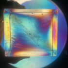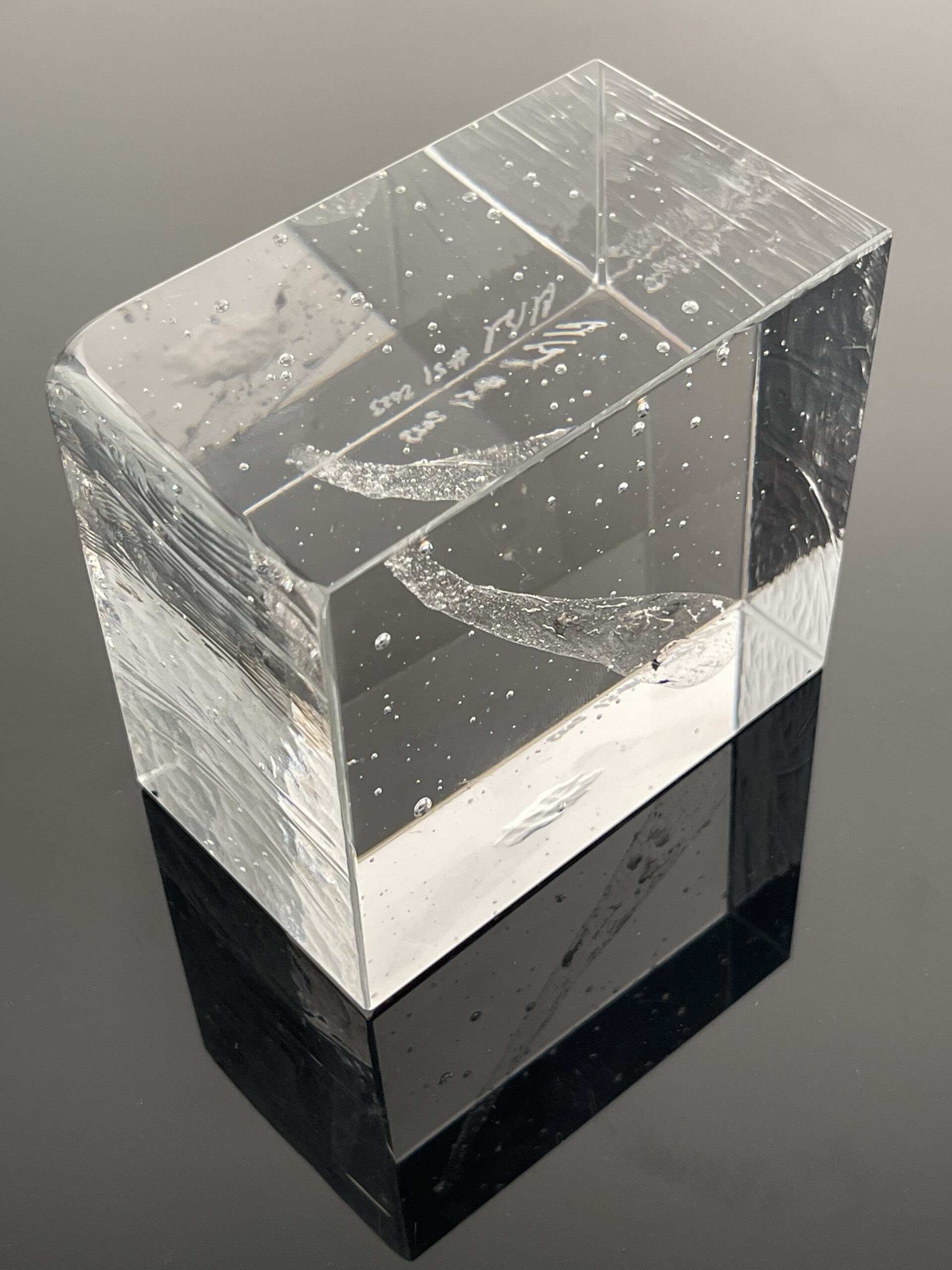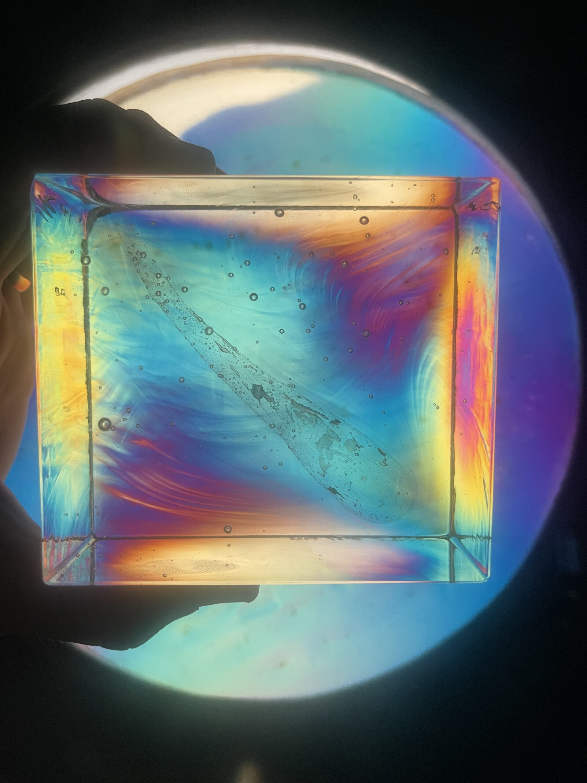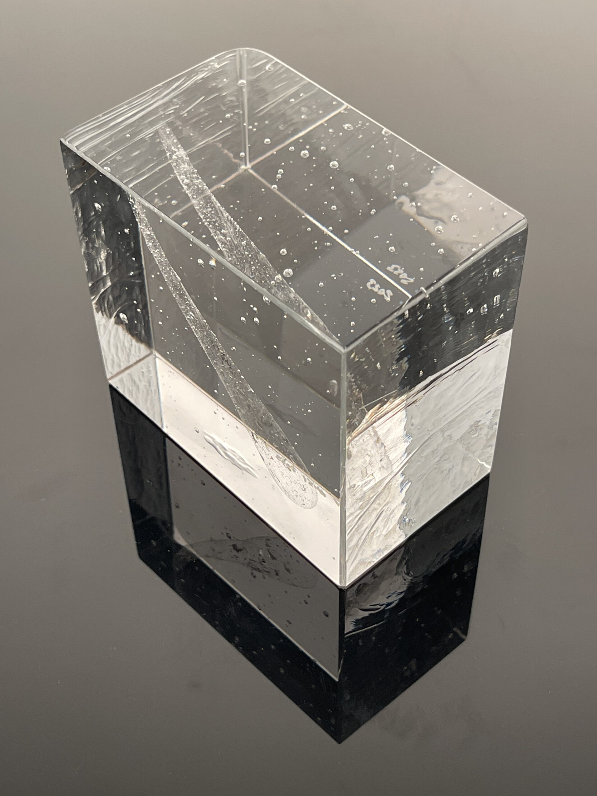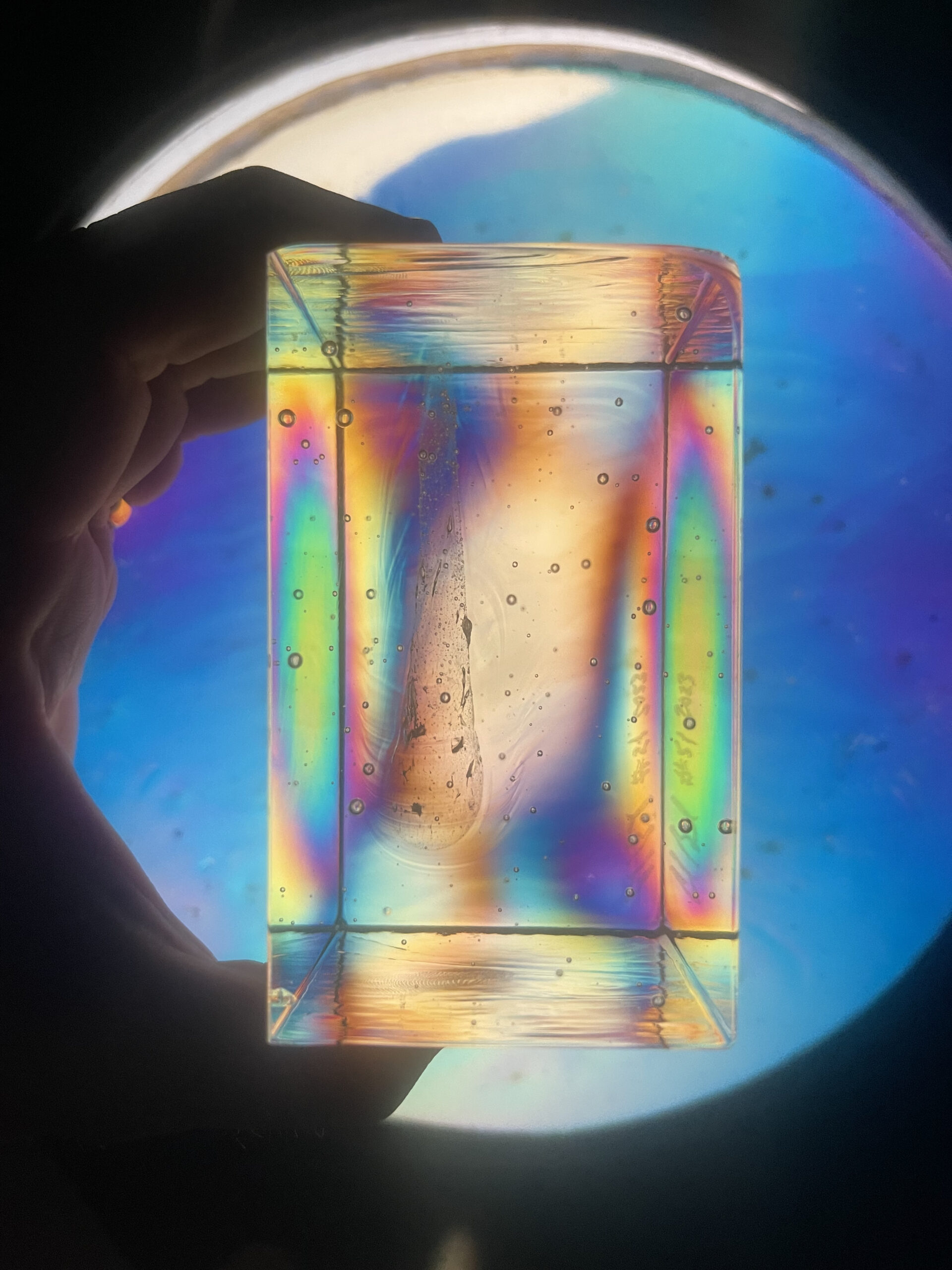 As a sculptor, an ever-expanding understanding of materials is critical in refining one’s ability to fluently translate ideas into expressive physical objects.  These solid works in glass capture a moment in time where a Prince Rupert drop while in a state of great tension is trapped in molten glass when the tail is snapped, and the tension released.  Due to the viscosity of the molten glass, the moment of this tension release is captured in time.  Once, the solid pieces are cooled, carved, and polished an unexpected beauty is revealed under the light of a polariscope which is a tool glass makers use to see stress in their glass wares.  The unique stresses captured in these pieces are all remarkably beautiful.  The surprise of beauty in tension revealed through creative experimentation and exploration is a main reason I love making art. Part of this whole process of discovery was captured with the genius camera and talents of Destin Sandlin of Smarter Every Day – a YouTube channel that is exploratory in nature. The whole video is available HERE.