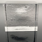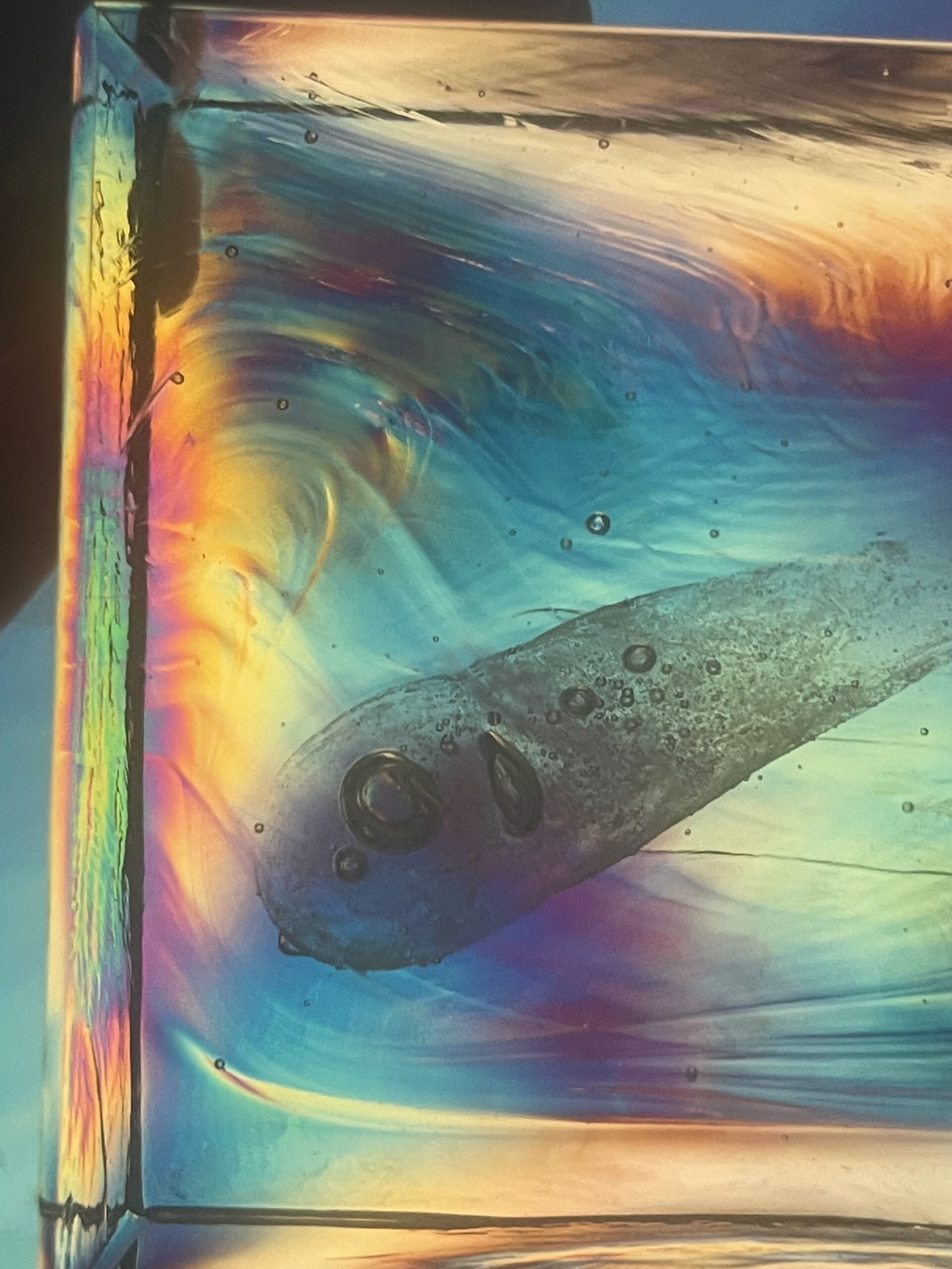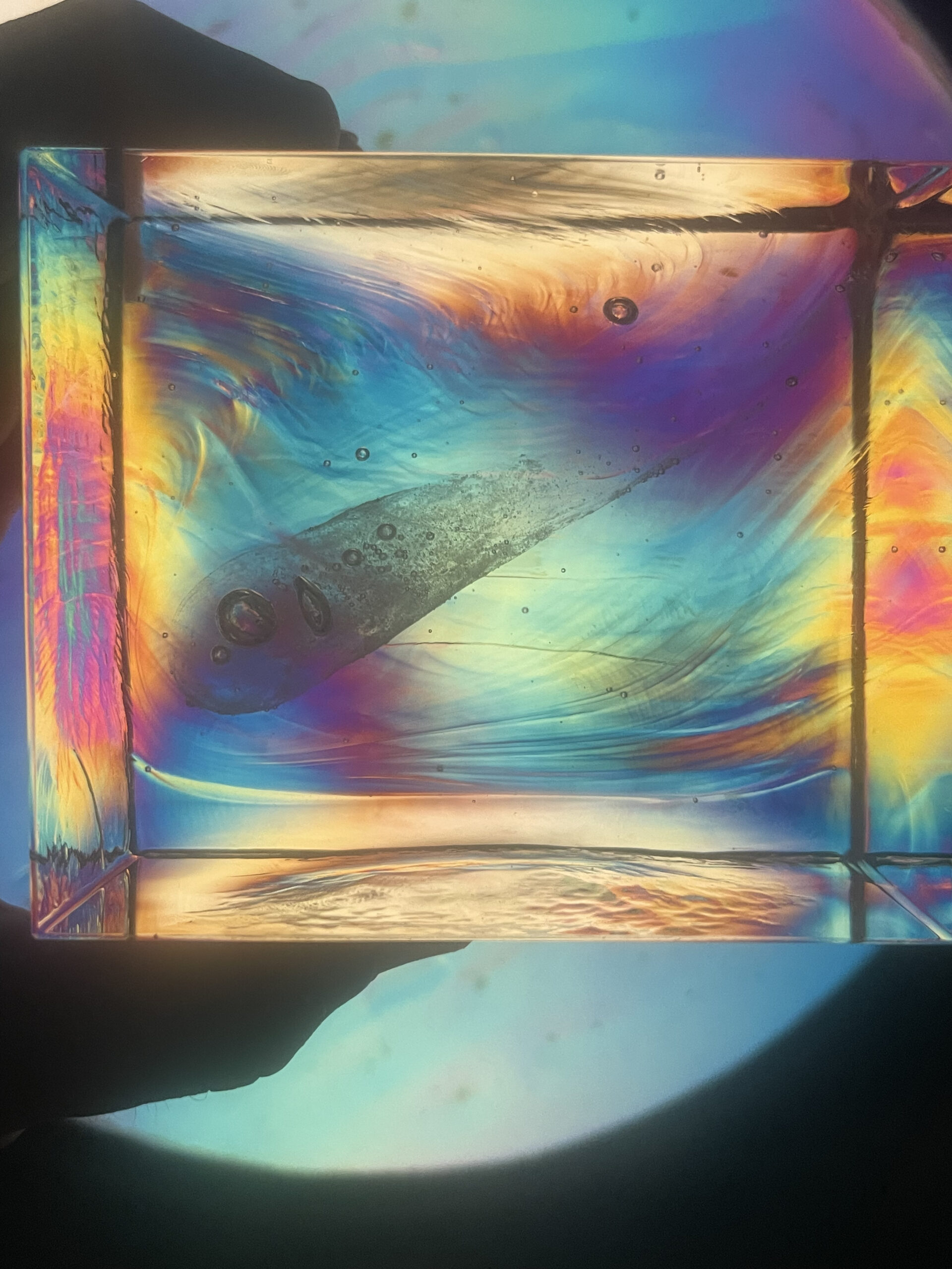 As a sculptor, an ever-expanding understanding of materials is critical in refining one’s ability to fluently translate ideas into expressive physical objects.  These solid works in glass capture a moment in time where a Prince Rupert drop while in a state of great tension is trapped in molten glass when the tail is snapped, and the tension released.  Due to the viscosity of the molten glass, the moment of this tension release is captured in time.  Once, the solid pieces are cooled, carved, and polished an unexpected beauty is revealed under the light of a polariscope which is a tool glass makers use to see stress in their glass wares.  The unique stresses captured in these pieces are all remarkably beautiful.  The surprise of beauty in tension revealed through creative experimentation and exploration is a main reason I love making art. Part of this whole process of discovery was captured with the genius camera and talents of Destin Sandlin of Smarter Every Day – a YouTube channel that is exploratory in nature. The whole video is available HERE.